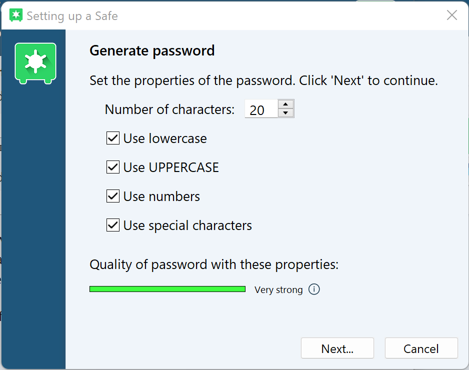 Secure your Safes with TOTP 2-Factor-Authentication, using popular apps like e.g. Authy, Microsoft Authenticator or Google Authenticator as a second factor.Password quality indicator